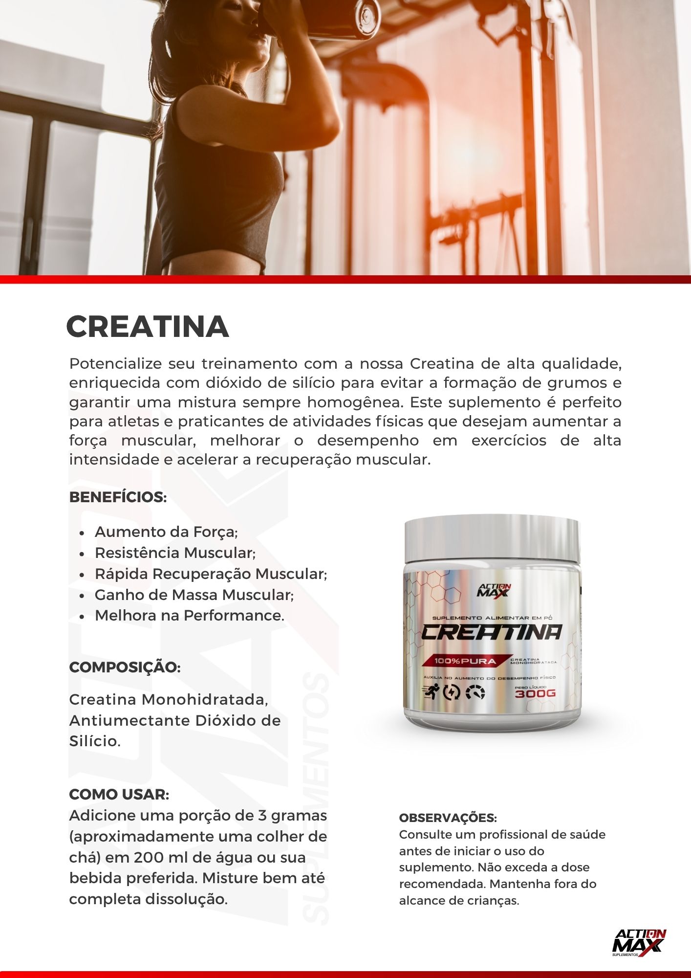 Ingredientes: Creatina Monohidratada, Antiumectante Dióxido de Silício.